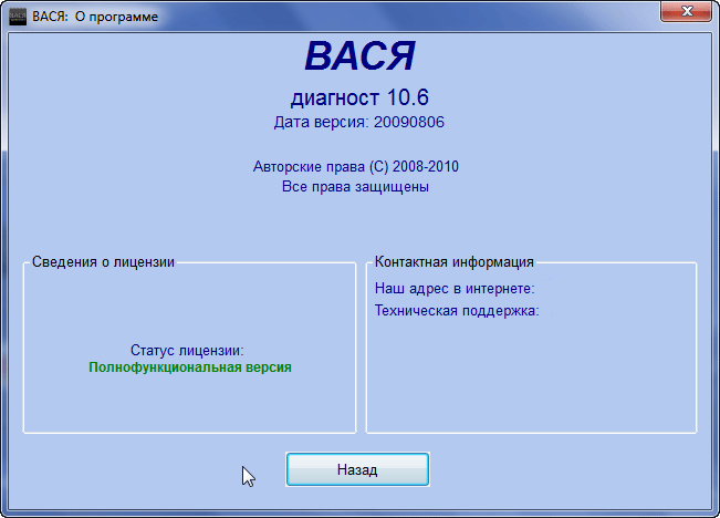 ВАСЯ диагност работает со многими автомобилями концерна VAG, выпущенными в период с 1994г. по 2010г., использую диагностический разъем OBD-II. Если Ваш автомобиль имеет старый разъем 2x2, то для использования программы необходимо дополнительно приобресьти переходник.